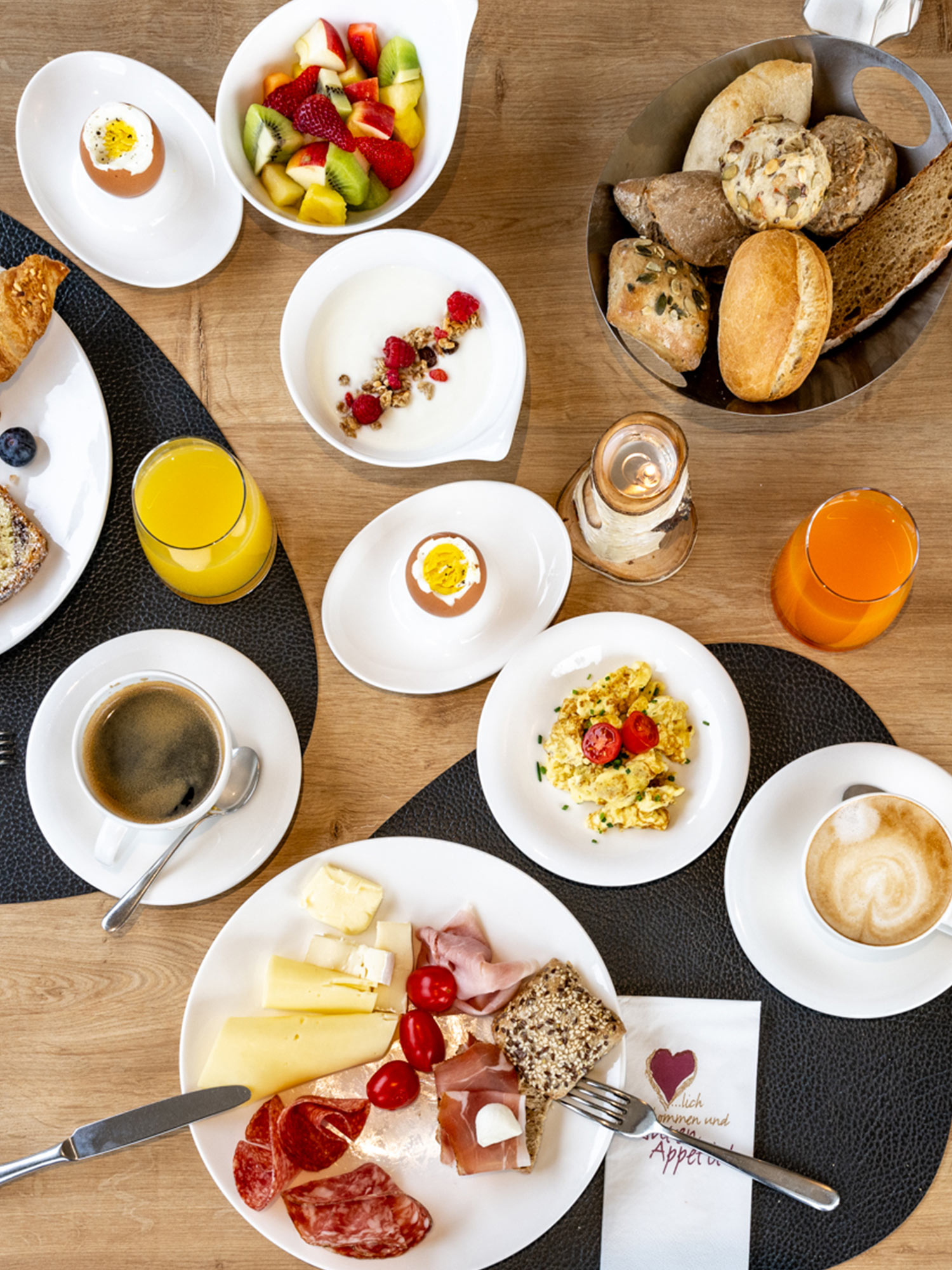 Per iniziare al meglio la vostra giornata di vacanza vi proponiamo una ricca colazione a buffet con bontà regionali: molti prodotti, inoltre, provengono direttamente dal maso di proprietà dello Schmiedhof. Ad ogni boccone assaporerete quindi il luogo in cui state trascorrendo la vostra vacanza. Ad infondervi nuove energie troverete marmellate e composte di frutta fatte in casa, dolci appena sfornati e una buona tazza di caffè. Per la colazione utilizziamo esclusivamente prodotti di cui siamo assolutamente convinti della qualità.
